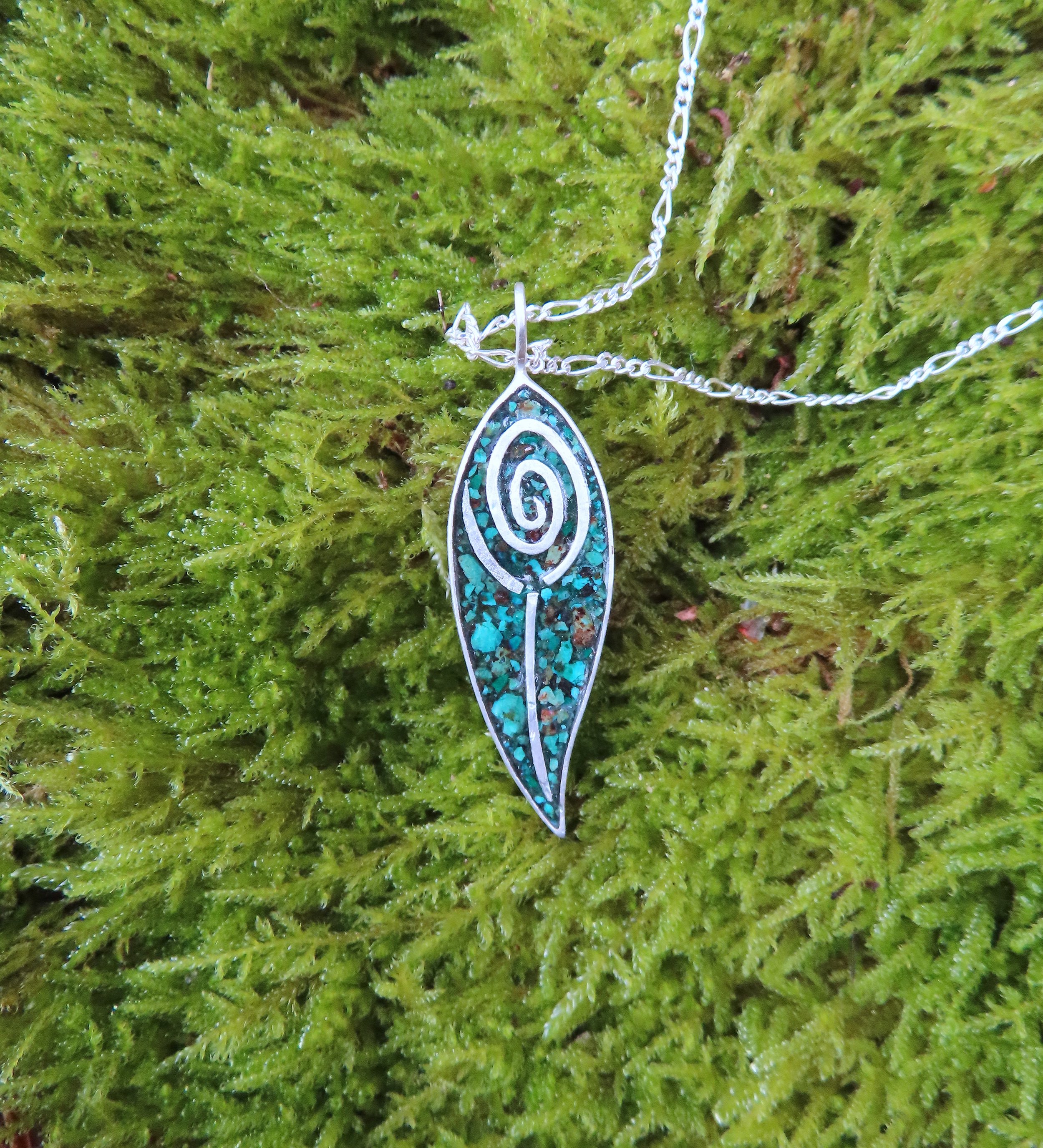 Sterling sølv vedhæng, med små stykker af en sten fra en afrikansk kobbermine, støbt i epoxy resin. Denne kommission inklusive matchende øreringe kostede 1000Kr.